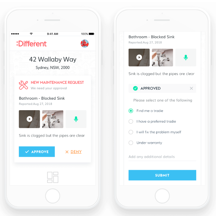 That’s why, just before the holidays, we released a new maintenance feature that gives property owners one-click access to view, approve and get more information about maintenance requests directly from a phone or computer via our tenant app and owner app. Now, when your tenant files a maintenance request through the app, the team at :Different can review it and either resolve it or send it through to you, if we believe it’s a valid request.