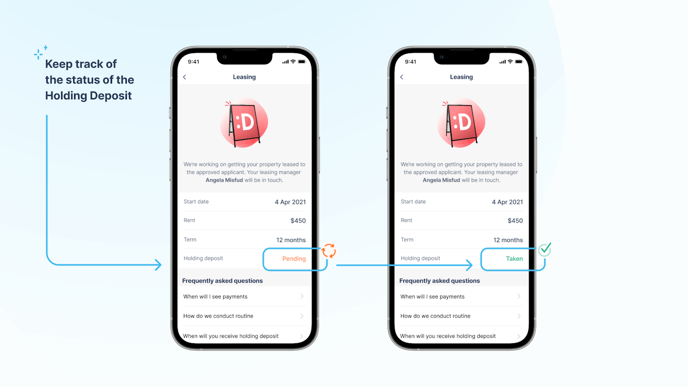 Once you’ve approved an applicant through the Owner App, we take care of all the details by contacting the tenant for you, getting the lease signed as well as collecting the holding deposit. You can also view the status of the holding deposit right from the leasing details screen - no need to pick up the phone or keep checking your email!