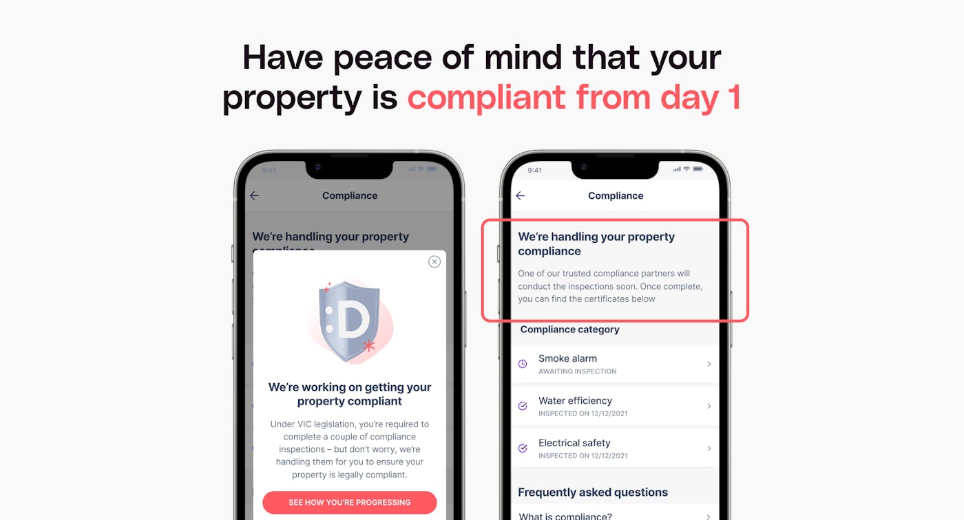When it comes to having peace of mind that you’re legally covered (with as little effort from your end as possible), having us manage all your compliance for you is a no-brainer. Not only are you able to keep track of your compliance status in a single place in your Owner App, but you’ll also stay organised and in control, knowing exactly what your compliance responsibilities are, how each item is being managed, and that you and your property are legally compliant.